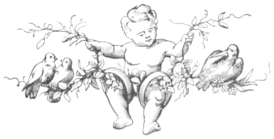 Maybe it’s just me but the drawing does seem a little weird. Cupid looks a bit like he is swinging on a swing and yet the pair of birds sit on one side of the branch and a larger bird with a pointed beak is sitting on the other. I wonder if the larger bird is supposed to be a stork; as in the stork who brings babies to happy couples. He’s a bit small for that but the beak is right.