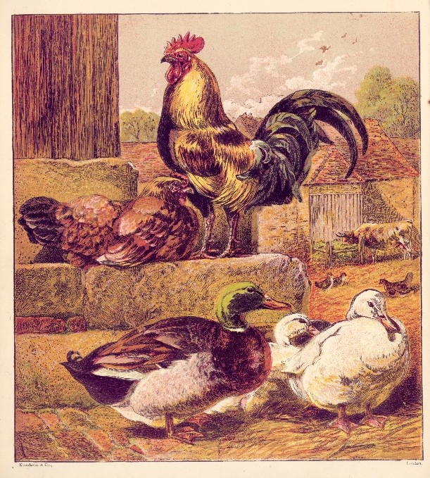 A mallard duck and two white ducks join a number of other birds and animals in the barnyard in this full-color vintage drawing of birds. The ducks could easily be cropped out of this picture and used separately.