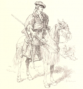 There’s something truly interesting about this vintage drawing. We have a fierce-looking man, fully armed to protect his family, animals and farm. However, he sits astride a horse that somehow has a sweet and charming look about it.