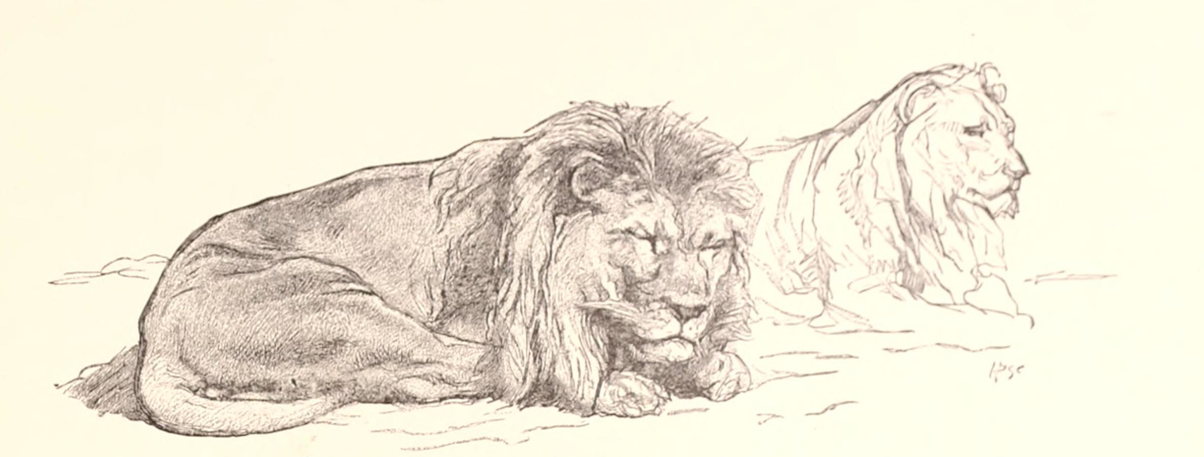 This drawing is the work of the wonderful French artist Rosa Bonhuer (1822-1899). Bonhuer was most well-known for her realistic drawings and paintings of animals. The pair of lions featured in this post are from a 1900 publication that features many of her drawings – Atelier Rosa Bonheur by Leon Roger-Miles (1859-1928).