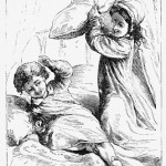 Baby’s RevengeCute drawing of a curly-headed toddler putting a triumphant end to her brother’s drum. |